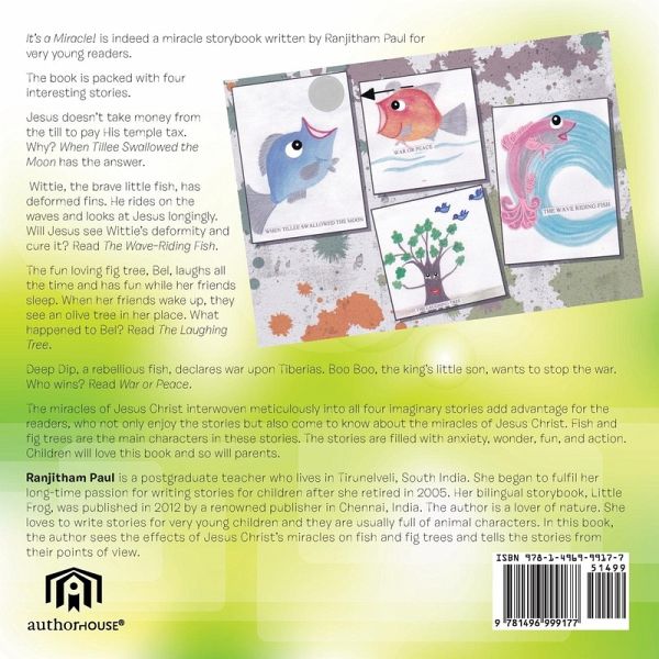 It's a Miracle! is indeed a miracle storybook written by Ranjitham Paul for very young readers. The book is packed with four interesting stories. Jesus doesn't take money from the till to pay His temple tax. Why? When Tillee Swallowed the Moon has the answer. Wittie, the brave little fish, has deformed fins. He rides on the waves and looks at Jesus longingly. Will Jesus see Wittie's deformity and cure it? Read The Wave-Riding Fish. The fun loving fig tree, Bel, laughs all the time and has fun while her friends sleep. When her friends wake up, they see an olive tree in her place. What happened to Bel? Read The Laughing Tree. Deep Dip, a rebellious fish, declares war upon Tiberias. Boo Boo, the king's little son, wants to stop the war. Who wins? Read War or Peace. The miracles of Jesus Christ interwoven meticulously into all four imaginary stories add advantage for the readers, who not only enjoy the stories but also come to know about the miracles of Jesus Christ. Fish and fig trees are the main characters in these stories. The stories are filled with anxiety, wonder, fun, and action. Children will love this book and so will parents.