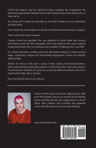 Credit risk analysts dig into detail and piece together the unexpected. We determine appropriate remedial actions and communicate them effectively. It's what we do. But things don't always go smoothly, so we need to make sure we understand the basics first. Most credit risk analysts learn on the job, with little external material or support. That's where this book comes in. Carolyn Röhm has identified the core elements of retail credit risk analysis and broken them into first principles. She firmly believes that once analysts understand these, they can address every problem, challenge and curve ball. It's a Risky Business is a field guide that will enable analysts to make intuitive leaps, understand, analyse and recommend appropriate actions and identify opportunities. Written for those at the start or early in their careers, this book provides a solid understanding of all things related to retail consumer credit risk analytics. From that point onwards, it is up to you to put the skills into practice. And if you need further help, talk to Carolyn. May the odds be ever in your favour!