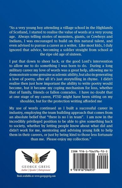 As a very young boy attending a village school in the Highlands of Scotland, I started to realise the value of words at a very young age. Always telling stories of monsters, giants, or cowboys and Indians, I was encouraged to build on this natural talent, and even advised to pursue a career as a writer. Like most kids, I duly ignored that advice, becoming a soldier straight from school at the ripe old age of sixteen. I put that down to sheer luck, or the good Lord's intervention to allow me to do something I was born to do. During a long military career my love of words was a great help, allowing me to demonstrate some genuine academic ability, but also in in generating a love of poetry, after all it's just storytelling in rhyme. I didn't realise then just how important the ability to write poetry would become, but it became my coping mechanism for loss, whether that of family, friends or fallen comrades. I have no doubt that at one stage of my career, PTSD might have been sitting on my shoulder, but for the protection writing afforded me. My use of words continued as I built a successful career in industry, employing the team building approach that comes from an absolute belief that "there is no I in team". I am now in the incredibly privileged position to be able to give something back to society, whether by letting people know about what did and what didn't work for me, mentoring and advising young folk to help them in their careers, or just by being kind to those less fortunate than me.