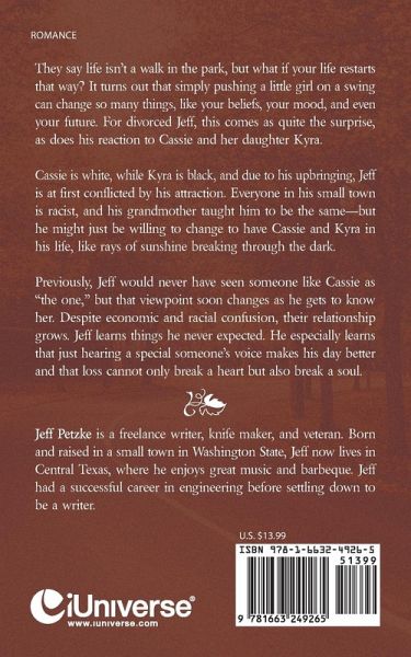 They say life isn't a walk in the park, but what if your life restarts that way? It turns out that simply pushing a little girl on a swing can change so many things, like your beliefs, your mood, and even your future. For divorced Jeff, this comes as quite the surprise, as does his reaction to Cassie and her daughter Kyra. Cassie is white, while Kyra is black, and due to his upbringing, Jeff is at first conflicted by his attraction. Everyone in his small town is racist, and his grandmother taught him to be the same-but he might just be willing to change to have Cassie and Kyra in his life like rays of sunshine breaking through the dark. Previously, Jeff would never have seen someone like Cassie as "the one," but that viewpoint soon changes as he gets to know her. Despite economic and racial confusion, their relationship grows. Jeff learns things he never expected. He especially learns that just hearing a special someone's voice makes his day better and that loss can not only break a heart but also break a smile.