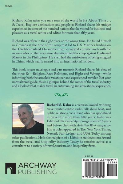 Richard Kahn takes you on a tour of the world in It's About Time . . . & Travel. Explore destinations and people as Richard shares his unique experiences in some of the hundred nations that he visited for business and pleasure as a travel writer and editor for more than fifty years. Richard was often in the right place at the wrong time. He found himself in Grenada at the time of the coup that led to U.S. Marines landing on that Caribbean island. On another trip, he enjoyed a private lunch with the woman who, on that very same day, attempted the coup against Ferdinand Marcos in the Philippines. He even had the misfortune of being mugged in China, which nearly turned into an international incident. This book is part travelogue and part memoir. Richard shares his view of the three Rs-Religion, Race Relations, and Right and Wrong-while informing both the armchair vacationer and experienced traveler. Not your normal travel guide, this is a glimpse behind the scenes of the travel industry and a look at what makes travel an entertaining and educational experience.
