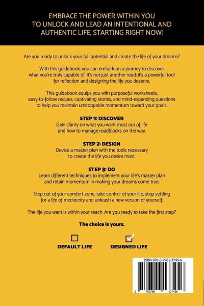 Embrace the power within you to unlock and lead an intentional and authentic life, starting right now! Are you ready to unlock your full potential and create the life of your dreams? With this guidebook, you can embark on a journey to discover what you're truly capable of. It's not just another read; it's a powerful tool for reflection and designing the life you deserve. This guidebook equips you with purposeful worksheets, easy-to-follow recipes, captivating stories, and mind-expanding questions to help you maintain unstoppable momentum toward your goals. STEP 1: DISCOVER. Gain clarity on what you want most out of life and how to manage roadblocks on the way. STEP 2: DESIGN. Devise a master plan with the tools necessary to create the life you desire most. STEP 3: DO. Learn different techniques to implement your life's master plan and retain momentum in making your dreams come true. Step out of your comfort zone, take control of your life, stop settling for a life of mediocrity and unleash a new version of yourself. The life you want is within your reach. Are you ready to take the first step? The choice is yours. Default or designed life?