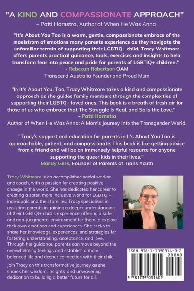 Embark on a transformative journey in "It's About You Too", by Tracy Whitmore, to support your LGBTQ+ child while nurturing your own emotions. Many have said, "It's not about you! Put your feelings aside and be there for your child." However, Tracy understands it's not easy to simply set aside profound emotions and recognises the importance of being present for your child during this challenging time. She offers a remarkable approach, creating a safe and expansive environment for exploring, processing, and healing these emotions. By embracing this path, you can become an unwavering advocate and ally, loving your child unconditionally and embracing them wholeheartedly. With compassion, Tracy guides you through the struggle, helping you delve into your beliefs, values, thoughts, and emotions, repairing any potential damage to your relationship. This invaluable process equips you with the tools to navigate this parenting journey with grace and understanding, while your child feels loved and supported. Ultimately, you'll arrive at a place of celebration and deep connection with your child, fostering a sense of unity within your entire family. Witness the profound growth as you and your family flourish in a compassionate, inclusive environment.