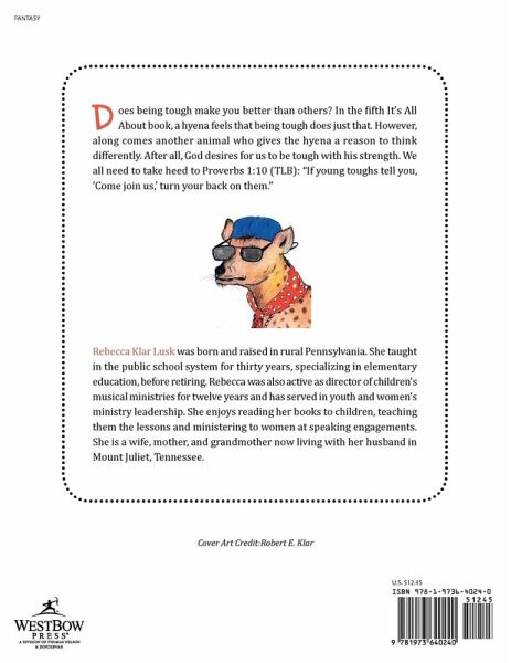 Does being tough make you better than others? In the fifth It's All About book, a hyena feels that being tough does just that. However, along comes another animal who gives the hyena a reason to think differently. After all, God desires for us to be tough with his strength. We all need to take heed to Proverbs 1:10 (TLB): "If young toughs tell you, 'Come join us,' turn your back on them."