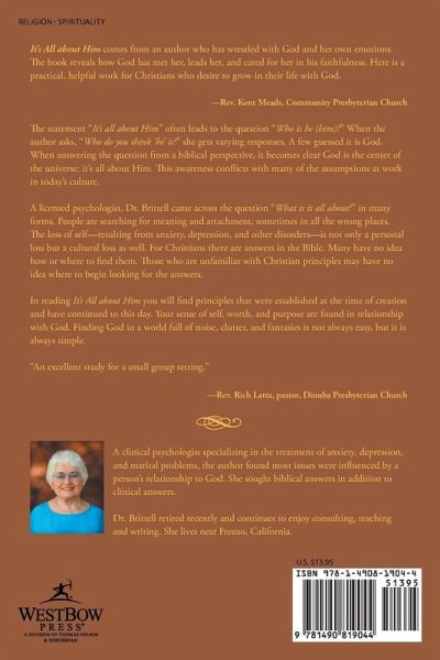 The statement "It’s all about Him" often leads to the question "Who is he (him)?" When the author asks, "Who do you think ‘he’ is?" she gets varying responses. Some think it is her late husband; others, some famous person. A few guessed it is God. When answering the question from a biblical perspective, it becomes clear God is the center of the universe: it’s all about Him. This awareness conflicts with many of the assumptions at work in today’s culture. A licensed psychologist, Dr. Brittell came across the question "What is it all about?" in many forms. People are searching for meaning and attachment, sometimes in all the wrong places. The loss of self—resulting from anxiety, depression, and other disorders—is not only a personal loss but a cultural loss as well. For Christians there are answers in the Bible. Many have no idea how or where to find them. Those who are unfamiliar with Christian principles may have no idea where to begin looking for the answers. In reading It’s All about Him you will find principles that were established at the time of creation and have continued to this day. Your sense of self, worth, and purpose are found in relationship with God. Finding God in a world full of noise, clutter, and fantasies is not always easy, but it is always simple. "An excellent study for a small group setting." —The Reverend Rich Latta, pastor, Dinuba Presbyterian Church