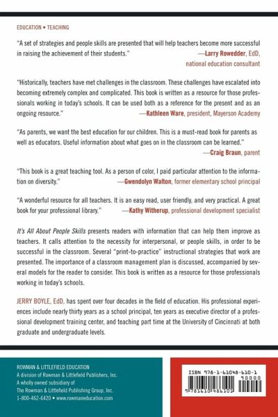 It's All About People Skills provides teachers with information upon which they that can improve themselves in the classroom, calling to attention the necessity for interpersonal skills in order be successful in front of the classroom. Offering educators 'print-to-practice' instructional strategies, models of classroom management plans, and planning modules, It's All About People Skills will not only improve teachers' instructional delivery, and therefore engage more students in a positive school culture, but will also prepare teachers to meet the challenges of contemporary schooling-such as adapting to technology, working with home-schooled children, and addressing school violence.