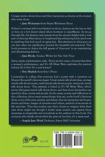 Unique stories about shoes and their memories as diverse as the women who write them. — Jane Weitzman from Stuart Weitzman Shoes If there’s a woman who’s not fixated on shoes, chances are she has no feet or lives on a hot desert island where footwear is superfluous. As we go through life, the fixation may mutate from the annual delight with a new pair of dress-up Mary Janes, to height-and-leg enhancing heels and boots to anything that feels good on aging feet. But attention to what goes on our feet often has significance beyond the beautiful and practical. This book promises to depict the full gamut of ‘shoe-ness’ in an entertaining and illuminating fashion. — Jane Brody, Science Writer for New York Times Savvy, smart, sophistication, style. Shoes are the source of power that drive a woman’s performance, and It’s All About Shoes captivates the passion behind all of this! It’s a real winner! — Eric Mudick from Eric’s Shoes I remember in college that someone had a poster with a variation on Eleanor Roosevelt’s famous slogan ‘Great minds talk about ideas, average minds talk about events, small minds talk about people, miniscule minds talk about shoes.’ This attitude is belied in It’s All About Shoes, which proves that great minds talk about shoes, and that shoes themselves can stand for ideas, events and people. In the essays, poems and reflections in this collection, shoes mean many things; they are, as the book’s divisions show, icons of the past, present, and future; they are memories and hopes, desires and fears, images of ourselves and others, symbols of moments in life and time. They lure readers into their closets to imagine what their own shoes might say, though I doubt many readers can express these meanings as eloquently and evocatively as the authors in this book. For everyone who thinks about what she puts on her feet, it’s a must read. — Angela Jane Weisl, Professor, Seton Hall University