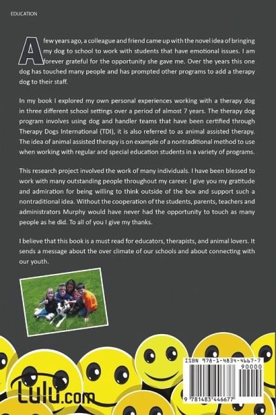 Years ago, a colleague came up with the novel idea of bringing my dog to school to work with students with emotional issues. Since then this one dog has touched many people and has prompted other programs to add a therapy dog to their staff. My book explores my personal experiences working with a therapy dog in three different school settings over a 7-year period. The therapy dog program involves using dog and handler teams that have been certified through Therapy Dogs International (TDI). Animal assisted therapy is a nontraditional method for working with regular and special education students in a variety of programs. This research project involved the work of many individuals. I have been blessed to work with many outstanding people throughout my career who have been willing to think outside of the box and support such a nontraditional idea. This book is a must read for educators, therapists, and animal lovers and sends a message about the climate of our schools and connecting with our youth.