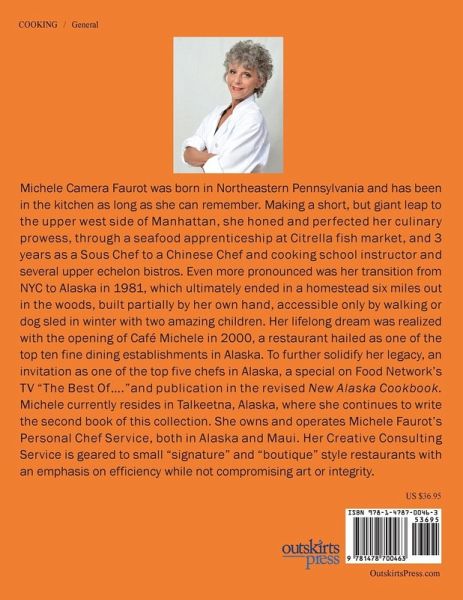 Michele Camera Faurot was born in Northeastern Pennsylvania and has been in the kitchen as long as she can remember. Making a short, but giant leap to the upper west side of Manhattan, she honed and perfected her culinary prowess, through a seafood apprenticeship at Citrella fish market, and 3 years as a Sous Chef to a Chinese Chef and cooking school instructor and several upper echelon bistros. Even more pronounced was her transition from NYC to Alaska in 1981, which ultimately ended in a homestead six miles out in the woods, built partially by her own hand, accessible only by walking or dog sled in winter with two amazing children. Her lifelong dream was realized with the opening of Café Michele in 2000, a restaurant hailed as one of the top ten fine dining establishments in Alaska. To further solidify her legacy, an invitation as one of the top five chefs in Alaska, a special on Food Network's TV "The Best Of...."and publication in the revised New Alaska Cookbook. Michele currently resides in Talkeetna, Alaska, where she continues to write the second book of this collection. She owns and operates Michele Faurot's Personal Chef Service, both in Alaska and Maui. Her Creative Consulting Service is geared to small "signature" and "boutique" style restaurants with an emphasis on efficiency while not compromising art or integrity.