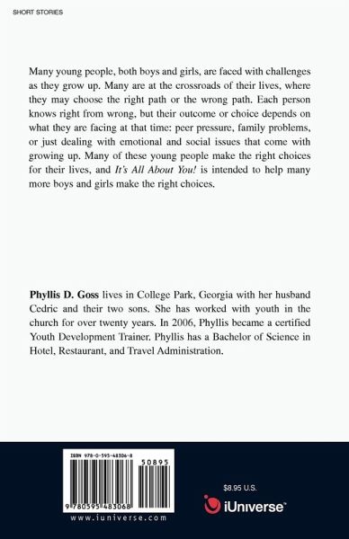 Many young people, both boys and girls, are faced with challenges as they grow up. Many are at the crossroads of their lives, where they may choose the right path or the wrong path. Each person knows right from wrong, but their outcome or choice depends on what they are facing at that time: peer pressure, family problems, or just dealing with emotional and social issues that come with growing up. Many of these young people make the right choices for their lives, and It's All About You! is intended to help many more boys and girls make the right choices.