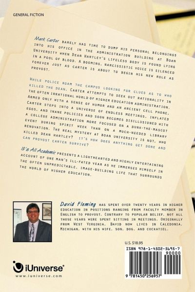 Mark Carter barely has time to dump his personal belongings into his office in the administration building at Boan University when Dean Hartley's lifeless body is found lying in a pool of blood. A booming, narcissistic voice is silenced forever just as carter is about to begin his new role as provost. While police roam the campus looking for clues as to who killed the dean, Carter attempts to seek out rationality in the often irrational world of higher education administration. Armed only with a sense of humor and an ancient cell phone, Carter steps into a universe of endless meetings, inflated egos, and inane policies and soon becomes disillusioned with a college administration more focused on a dunk-the-mascot event during spirit week than on a much-needed library renovation. The real mystery at Boan University is not, who killed Dean Hartley? it's how does anything get done and can Provost Carter survive? It's All Academic presents a lighthearted and highly entertaining account of one man's ill-fated year as he immerses himself in the often unpredictable, image-building life that surrounds the world of higher education.