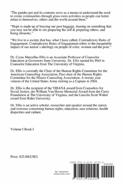 "The gumbo pot and its contents serve as a means to understand the need to create communities through grass roots activities so people can better relate to themselves, others and the world around them." This book focuses on multiple layers of culture in the United States. It is a text that addresses cultural phenomena through the metaphor of Gumbo, a southern cuisine developed by slaves. It's All Gumbo to Me is a phrase that captures an understanding that we are all in this world together. Like gumbo, we are all in the pot together. We may be saddened or outraged by the events of life that occur, but we ought not be surprised. We can, however, impact our world for the better by adding ingredients of hope, meaning and spirit (among others) to the pot so that the circumstances that we find ourselves in can be altered thereby making our world better for ourselves and our communities.
