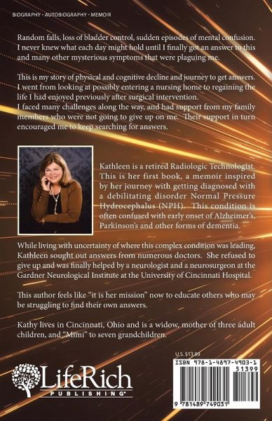 Random falls, loss of bladder control, sudden episodes of mental confusion. I never knew what each day might hold until I finally got an answer to this and many other mysterious symptoms that was plaguing me. This is my story of physical and cognitive decline and journey to get answers. I went from looking at possibly entering a nursing home to regaining the life I had enjoyed previously after surgical intervention. I faced many challenges along the way, and had support from my family members who were not going to give up on me. Their support in turn encouraged me to keep searching for answers.