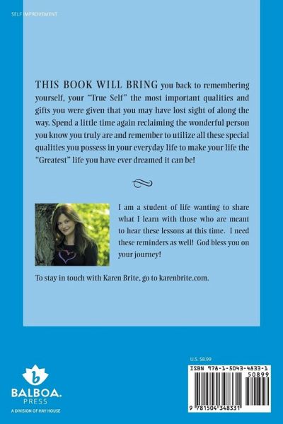This book will bring you back to remembering yourself, your "True Self" the most important qualities and gifts you were given that you may have lost sight of along the way. Spend a little time again reclaiming the wonderful person you know you truly are and remember to utilize all these special qualities you possess in your everyday life to make your life the "Greatest" life you have every dreamed it can be!