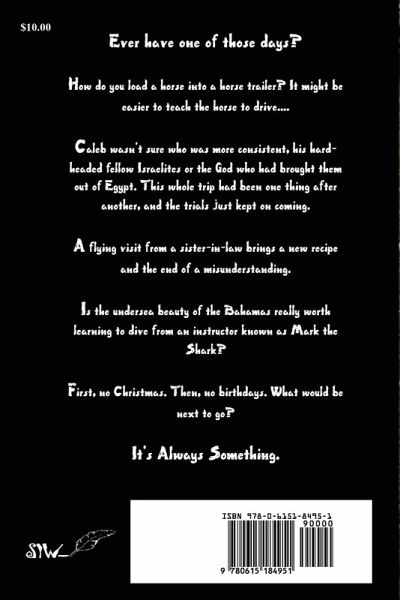 Ever have one of those days? How do you load a horse into a horse trailer? It might be easier to teach the horse to drive.. Caleb wasn't sure who was more consistent, his hard-headed fellow Israelites or the God who had brought them out of Egypt. This whole trip had been one thing after another, and the trials just kept on coming. A flying visit from a sister-in-law brings a new recipe and the end of a misunderstanding. Is the undersea beauty of the Bahamas really worth learning to dive from an instructor known as Mark the Shark? First, no Christmas. Then, no birthdays. What would be next to go? It's Always Something....