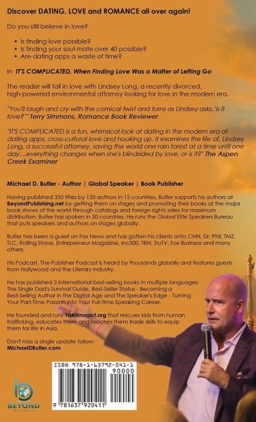 Discover DATING, LOVE and ROMANCE all over again! Do you still believe in love? · Is finding love possible? · Is finding your soul-mate over 40 possible? · Are dating apps a waste of time? In IT'S COMPLICATED, When Finding Love Was a Matter of Letting Go The reader will fall in love with Lindsey Long, a recently divorced, high-powered environmental attorney looking for love in the modern era. "You'll laugh and cry with the comical twist and turns as Lindsey asks, 'is it love?"' Terry Simmons, Romance Book Reviewer "IT'S COMPLICATED is a fun, whimsical look at dating in the modern era of dating apps, cross-cultural love and hooking up. It examines the life of, Lindsey Long, a successful attorney, saving the world one rain forest at a time until one day....everything changes when she's blindsided by love, or is it?" The Aspen Creek Examiner ------------------------------- EXCERPT: In the months leading up to this official declaration [the divorce papers] Lindsey had gone through quite the spectrum of emotions. "It's been over for a while now. It's just a piece of paper," she'd told her mother. "I can't move on with my life until I know it's completely over!" she'd declared to her therapist. "I kinda forget that I'm still married," she lied to her best friend. "Is your dad seeing anyone?" she occasionally asked her daughter. Then it just showed up... anti-climactically. And so she ignored it. Lindsey had gone about her day as intended right up until she'd accidentally kissed Dale from Work. She didn't really know Dale from Work. In fact, the only reason his name was suddenly Dale from Work was that she didn't even know his last name. They had been at their colleague's birthday party....