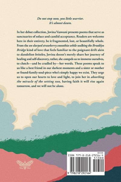 In her debut collection, Jovina Vaswani presents poems that serve as sanctuaries of solace and candid acceptance. Readers are welcome here in their entirety, be it fragmented, lost, or beautifully whole. From the "we slurped strawberry smoothies while walking the Brooklyn Bridge" kind of love that feels familiar to the poignant drift akin to "dandelion bristles," Jovina doesn't merely share her journey of healing and self-discovery, rather, she compels us to immerse ourselves, to clutch-and be cradled by-her words. These poems speak to us like a best friend in our darkest moments and a sister or mother or found-family-soul-piece who's simply happy we exist. They urge us to open our hearts to love and light, to join her in "absorbing the miracle of the setting sun," having faith it will rise again tomorrow, and we will not be alone.