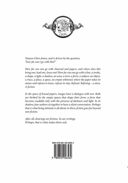 Yanyun Chen draws, and is driven by the question, "how far can I go with this?" How far can one go with charcoal and papers, and where does this bring one, lead one, leave one? How far can one go with a line, a stroke, a shape, a light, a shadow, an area, a turn, a form, a subject, an object, a trace, a place, a space, an empty whiteness where the paper takes its stance and refuses to leave, refuses to stay. Refusal. Refusing - a story. A fiction. In the space of bound papers, images have a dialogue with text. Both are birthed by the empty spaces that shape their form; a form that becomes readable only with the presence of darkness and light. In its shadow, four authors sit together to have a silent conversation. Perhaps that is what being intimate is all about; in there, fiction goes far beyond non-fiction. After all, drawings are fictions. So are writings. Perhaps, that is what makes them real.