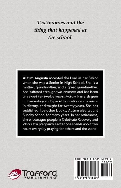 Autum Augusta accepted the Lord as her Savior when she was a Senior in High School. She is a mother, grandmother, and a great grandmother. She suffered through two divorces and has been widowed for twelve years. Autum has a degree in Elementary and Special Education and a minor in History, and taught for twenty years. She has published five other books, Autum also taught Sunday School for many years. I her retirement, she encourages people in Celebrate Recovery and Works at a pregnancy Center. She spends about two hours everyday praying for others and the world.