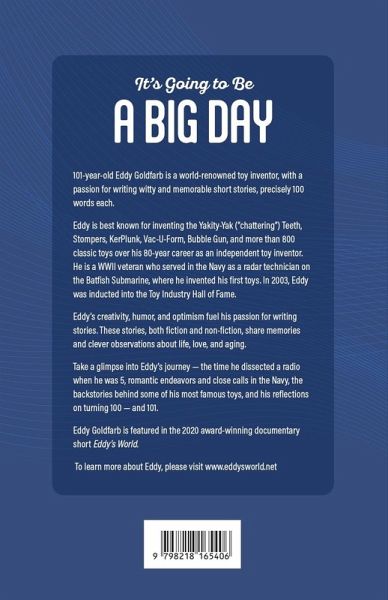 Eddy Goldfarb, now 101 years old, is one of the world's leading independent toy inventors. He is best known for the Yakity-Yak Teeth, Stompers, Ker Plunk, the Vac-U-Form and the Bubble Gun. During WWII, he volunteered for the Navy and served as a radar technician on the Batfish Submarine, where he invented his first toys. In 1949, he sold the Yakity Yak Teeth, the first of more than 800 classic toys over his 80 year career as a toy inventor. In 2003, Eddy was inducted into the Toy Industry Hall of Fame. Eddy's creativity, humor and optimism fuel his passion for writing stories, precisely 100 words each. These stories, both fiction and non-fiction, share memories of his life, and clever observations about life, love, and aging. Eddy Goldfarb is featured in the 2020 award-winning documentary short EDDY'S WORLD. To learn more about Eddy, please visit www.eddysworld.net