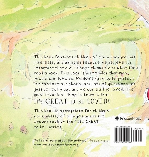 This book features children of many backgrounds, interests, and abilities because we believe it's important that a child sees themselves when they read a book. This book is a reminder that many people can love us. We don't have to be perfect. We can lose our shoes, ask lots of questions, or just be really sad and we can still be loved. The most important thing to know is that it's GREAT to be LOVED! This book is appropriate for children (and adults) of all ages and is the second book of the "It's GREAT to be" series.