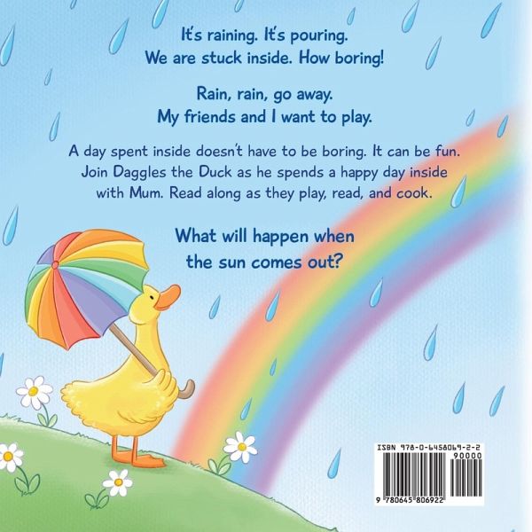 Back Cover Blurb_DAGGLES It's raining. It's pouring. We are stuck inside. How boring! Rain, rain, go away. My friends and I, want to play. A day spent inside doesn't have to be boring. It can be fun. Join Daggles the Duck as he spends a happy day inside with Mum. Read along as they play, read, cook and more.