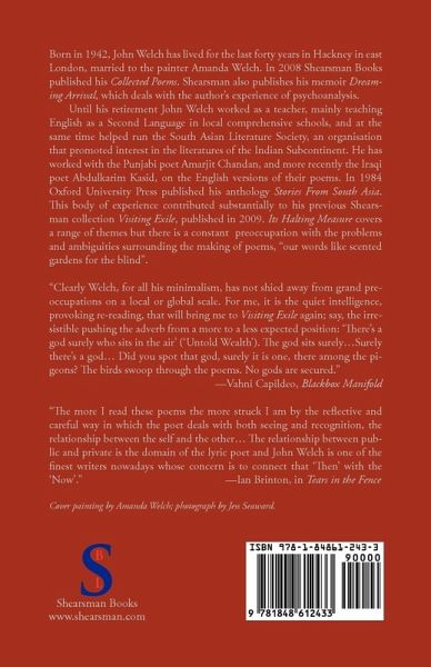 Born in 1942, John Welch has lived for the last forty years in Hackney in east London, married to the painter Amanda Welch. In 2008 Shearsman Books published his Collected Poems. Shearsman also publishes his memoir Dreaming Arrival which deals with the author's experience of psychoanalysis. Until his retirement John Welch worked as a teacher, mainly teaching English as a Second Language in local comprehensive schools, and at the same time helped run the South Asian Literature Society, an organisation that promoted interest in the literatures of the Indian Subcontinent. He has worked with the Punjabi poet Amarjit Chandan, and more recently the Iraqi poet Abdulkarim Kasid, on the English versions of their poems. In 1984 Oxford University Press published his anthology Stories From South Asia. This body of experience contributed substantially to his previous Shearsman collection Visiting Exile, published in 2009. Its Halting Meaasure covers a range of themes but there is a constant preoccupation with the problems and ambiguities surrounding the making of poems, 'our words like scented gardens for the blind'.