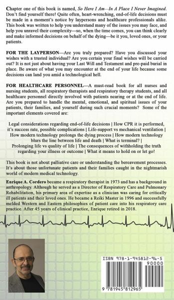"Previously published as "Death, Dying, and Modern Technology: How To Make Informed Decisions at The End of Life." by Enrique A Cordero. This new publication has been revised and updated. Thank you. Chapter one of this book is named, "So Here I Am-in a Place I Never Imagined." Don't find yourself there! Quite often, heart-wrenching, end-of-life decisions must be made in a moment's notice by laypersons and healthcare professionals alike. This book was written to help you understand many of the issues you may face, and help you unravel their complexity-so, when the time comes, you can think clearly and make informed decisions on behalf of the dying-be it you, loved ones, or your patients. FOR THE LAYPERSON: Are you truly prepared? Have you discussed your wishes with a trusted individual? Are you certain your final wishes will be carried out? It is not just about having your Last Will and Testament and pre-paid burial in place. Be aware of what you may encounter at the end of your life because some decisions can land you amid a technological hell. ¿FOR HEALTHCARE PERSONNEL: A must-read book for all nurses and nursing students, all respiratory therapists and respiratory therapy students, and all healthcare personnel directly involved with patients nearing or at the end of life. Are you prepared to handle the mental, emotional, and spiritual issues of your patients, their families, and yourself during such crucial moments? Some of the important elements covered are: Legal considerations regarding end-of-life decisions How CPR it is performed, it's success rate, possible complications Life-support vs mechanical ventilation How modern technology prolongs the dying process How modern technology blurs the line between life and death What is terminal? Prolonging life vs quality of life The consequences of withholding the truth regarding your illness or outcome What it means to hold on or let go! This book is not about palliative care or understanding the bereavement processes. It's about those unfortunate patients and their families caught in the nightmarish world of modern medical technology.
