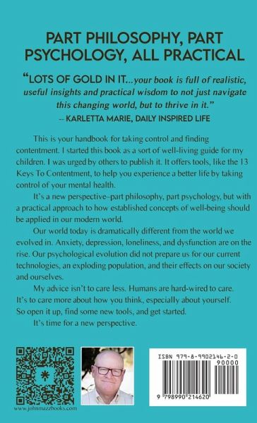 This is your toolbook for taking control and learning contentment. I started this book as a sort of well-living guide for my children. I was urged by others to publish it. It offers tools, like the 13 Keys To Contentment, to help you experience a better day by taking control of your mental health. It's a new perspective-part philosophy, part psychology, but with a practical approach to how established concepts of well-being should be applied in our modern world. Our world today is dramatically different from the world we evolved in. Anxiety, depression, loneliness, and dysfunction are on the rise. Our psychological evolution did not prepare us for our current technologies, an exploding population, and their effects on society and ourselves. My advice isn't to care less. Humans are hard-wired to care. It's to give more consideration to how you think, especially about yourself. So open it up, find some new tools, and get started. It's time for a new perspective.