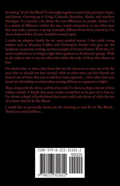 In writing " It's In The Blood" I've brought together a total of my past fears, hopes, and dreams. Growing up in Craig, Colorado, Kotzebue, Alaska, and northern Michigan, I've learned a lot about the vast differences in people. Rather if it is a matter of difference within the race, sexual orientation, or any other item that may make a person, or group of people, different from those around us, I've always believed that all men should be treated equal. I credit my adoptive family for my open minded nature. I also credit young authors such as Macaulay Culkin and Christopher Paolini who gave me the backbone, to put into writing, my best example of Science Fiction. With this, i've used a mythical race to bring to light that equalness to all minority groups. With it, the sadness that is way too often left within the wake of those that choose to hate. I've shown that, at times, that those that are the closest to us turn out to be the ones that we should not have trusted, while at other times our best friends are formed out of those that you would have least expected.... How often have you heard of a friendship or relationship starting off from an argument or fight? Then, along with the above, and then beyond, I've shown a deep contrast of love within a family. A family that many readers would love to be part of or close to. I've shown a depth of brotherhood that most could only dream of while the rest of us know that It's In The Blood. I would like to personally thank you for choosing to read It's In The Blood... Thank you and God bless...