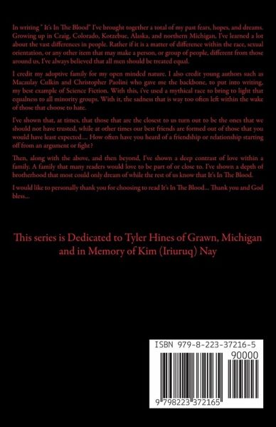 In writing " It's In The Blood" I've brought together a total of my past fears, hopes, and dreams. Growing up in Craig, Colorado, Kotzebue, Alaska, and northern Michigan, I've learned a lot about the vast differences in people. Rather if it is a matter of difference within the race, sexual orientation, or any other item that may make a person, or group of people, different from those around us, I've always believed that all men should be treated equal. I credit my adoptive family for my open minded nature. I also credit young authors such as Macaulay Culkin and Christopher Paolini who gave me the backbone, to put into writing, my best example of Science Fiction. With this, i've used a mythical race to bring to light that equalness to all minority groups. With it, the sadness that is way too often left within the wake of those that choose to hate. I've shown that, at times, that those that are the closest to us turn out to be the ones that we should not have trusted, while at other times our best friends are formed out of those that you would have least expected.... How often have you heard of a friendship or relationship starting off from an argument or fight? Then, along with the above, and then beyond, I've shown a deep contrast of love within a family. A family that many readers would love to be part of or close to. I've shown a depth of brotherhood that most could only dream of while the rest of us know that It's In The Blood. I would like to personally thank you for choosing to read It's In The Blood... Thank you and God bless...