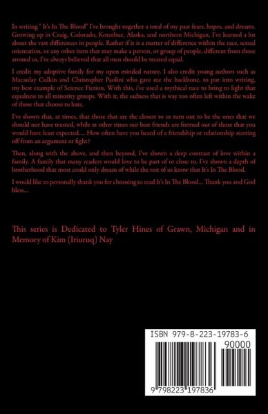 In writing " It's In The Blood" I've brought together a total of my past fears, hopes, and dreams. Growing up in Craig, Colorado, Kotzebue, Alaska, and northern Michigan, I've learned a lot about the vast differences in people. Rather if it is a matter of difference within the race, sexual orientation, or any other item that may make a person, or group of people, different from those around us, I've always believed that all men should be treated equal. I credit my adoptive family for my open minded nature. I also credit young authors such as Macaulay Culkin and Christopher Paolini who gave me the backbone, to put into writing, my best example of Science Fiction. With this, i've used a mythical race to bring to light that equalness to all minority groups. With it, the sadness that is way too often left within the wake of those that choose to hate. I've shown that, at times, that those that are the closest to us turn out to be the ones that we should not have trusted, while at other times our best friends are formed out of those that you would have least expected.... How often have you heard of a friendship or relationship starting off from an argument or fight? Then, along with the above, and then beyond, I've shown a deep contrast of love within a family. A family that many readers would love to be part of or close to. I've shown a depth of brotherhood that most could only dream of while the rest of us know that It's In The Blood. I would like to personally thank you for choosing to read It's In The Blood... Thank you and God bless...
