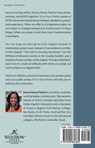 Award-winning author Donna Renay Patrick fuses praise, worship, and HOPE together. It's in Your Praise! speaks of HOPE not as mere desire but as holiness, obedience, power, and expectancy. When we offer to God genuine praise, we can expect a changed perspective toward each of these things. When our praise is real, then inner transformation is inevitable. For too long we have given God religion instead of relationship, great music instead of surrendered worship. In the chapter "The Call to Worship Revisited," see the difference between words on the Sunday bulletin and a mindset of total worship. In the chapter "A Praise Unlimited," learn how to create an attitude shift when you speak out God's praises on a regular basis. There is a definite connection between your private praise and your public praise. It's in Your Praise! will help you to embrace the connection.
