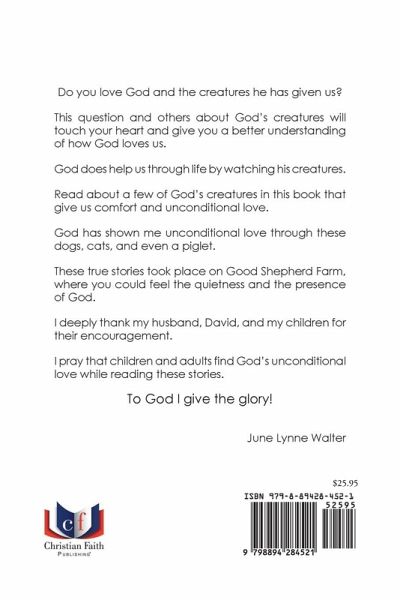 Do you love God and the creatures he has given us? This question and others about God's creatures will touch your heart and give you a better understanding of how God loves us. God does help us through life by watching his creatures. Read about a few of God's creatures in this book that give us comfort and unconditional love. God has shown me unconditional love through these dogs, cats, and even a piglet. These true stories took place on Good Shepherd Farm, where you could feel the quietness and the presence of God. I deeply thank my husband, David, and my children for their encouragement. I pray that children and adults find God's unconditional love while reading these stories. To God I give the glory! June Lynne Walter