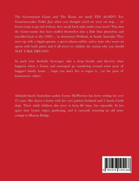 The Government Goose and The Koala are back! YES AGAIN!!! For Gooseness-sakes Folks! Just when you thought you'd set your rat trap ... (or Goose-trap) to get rid of them, they sneak back right under your nose!! This time the Goose-namic duo have stuffed themselves into a little blue phonebox and travelled back to the 1940's ... in downtown Welland, in South Australia! They meet up with a hippie-gnome, a green phone-rabbit, and a man who wears an apron with body parts; and it all serves to validate the reason why you should NOT TAKE DRUGS!!! So pack your alcoholic beverages, take a deep breath, and discover what happens when a Goose and marsupial go wandering around some poor ol' buggar's family home ... hope you don't live to regret it ...(or the poor ol' homeowner either).