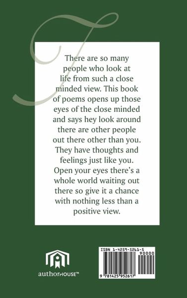 There are so many people who look at life from such a close minded view. This book of poems opens up those eyes of the close minded and says hey look around there are other people out there other than you. They have thoughts and feelings just like you. Open your eyes there's a whole world waiting out there so give it a chance with nothing less than a positive view.
