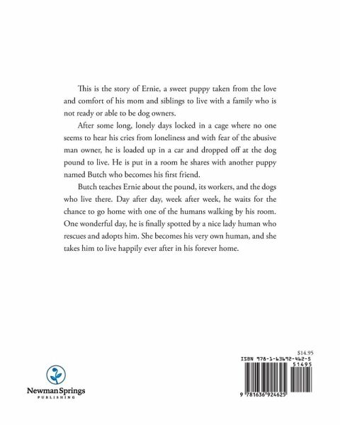This is the story of Ernie, a sweet puppy taken from the love and comfort of his mom and siblings to live with a family who is not ready or able to be dog owners. After some long, lonely days locked in a cage where no one seems to hear his cries from loneliness and with fear of the abusive man owner, he is loaded up in a car and dropped off at the dog pound to live. He is put in a room he shares with another puppy named Butch who becomes his first friend. Butch teaches Ernie about the pound, its workers, and the dogs who live there. Day after day, week after week, he waits for the chance to go home with one of the humans walking by his room. One wonderful day, he is finally spotted by a nice lady human who rescues and adopts him. She becomes his very own human, and she takes him to live happily ever after in his forever home.