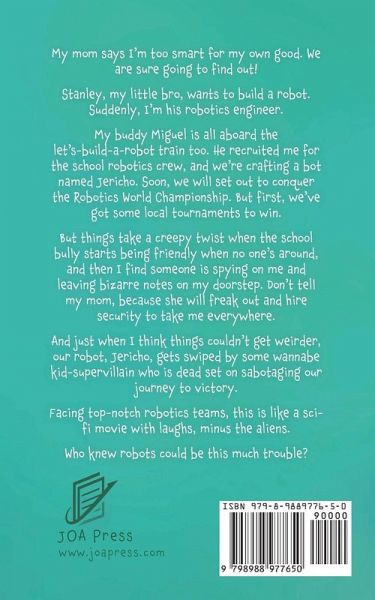 My mom says I'm too smart for my own good. We are sure going to find out! Stanley, my little bro, wants to build a robot. Suddenly, I'm his robotics engineer. My buddy Miguel is all aboard the let's-build-a-robot train too. He recruited me for the school robotics crew, and we're crafting a bot named Jericho. Soon, we will set out to conquer the Robotics World Championship. But first, we've got some local tournaments to win. But things take a creepy twist when the school bully starts being friendly when no one's around, and then I find someone is spying on me and leaving bizarre notes on my doorstep. Don't tell my mom, because she will freak out and hire security to take me everywhere. And just when I think things couldn't get weirder, our robot, Jericho, gets swiped by some wannabe kid-supervillain who is dead set on sabotaging our journey to victory. Facing top-notch robotics teams, this is like a sci-fi movie with laughs, minus the aliens. Who knew robots could be this much trouble? Start reading today!