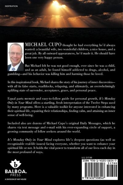 MICHAEL CUPO thought he had everything he’d always wanted: a beautiful wife, two wonderful children, a nice house, and a great job. By all outward appearances, he’d made it. He should have been one very happy person. But Michael felt he was not good enough, ever since he was a child, and as an adult, he found himself addicted to drugs, alcohol, and gambling—and his behavior was killing him and harming those he loved. In this inspirational book, Michael shares the story of his journey of inner discoveries—with all its false starts, roadblocks, relapsing, and ultimately, an overwhelmingly uplifting state of surrender, acceptance, grace, and personal peace. Equal parts memoir and easy-to-follow guide for personal growth, It’s Monday Only in Your Mind offers a startling, fresh interpretation of the Twelve Steps used by many programs. Here is a valuable toolkit for anyone interested in enhancing their spiritual life, repairing their relationships, finding calm, and attaining an inner sense of well-being. Included also are dozens of Michael Cupo’s original Daily Messages, which he shares via text message and e-mail with his ever-expanding circle of support, a growing community of fellow seekers around the world. It’s Monday Only in Your Mind explores life’s deepest questions (as well as recognizable real-life issues) facing everyone, whether you want to enhance your spiritual life or not. It holds the vital power to transform all of our lives each day in the most profound of ways.