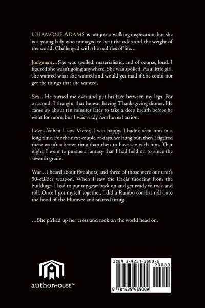 Chamone Adams is not just a walking inspiration, but she is a young lady who managed to beat the odds and the weight of the world. Challenged with the realities of life. Judgment.She was spoiled, materialistic, and of course, loud. I figured she wasn't going anywhere. She was spoiled. As a little girl, she wanted what she wanted and would get mad if she could not get the things that she wanted. Sex.He turned me over and put his face between my legs. For a second, I thought that he was having Thanksgiving dinner. He came up about ten minutes later to take a deep breath before he went for more, but I was ready for the real action. Love.When I saw Victor, I was happy. I hadn't seen him in a long time. For the next couple of days, we hung out, then I figured there wasn't a better time than then to have sex with him. That night, I went to pursue a fantasy that I had held on to since the seventh grade. War.I heard about five shots, and three of those were our unit's 50-caliber weapon. When I saw the Iraqis shooting from the buildings, I had to put my gear back on and get ready to rock and roll. Once I got myself together, I did a Rambo combat roll onto the hood of the Humvee and started firing. .She picked up her cross and took on the world head on.