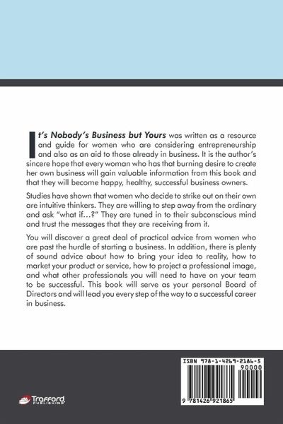 It's Nobody's Business but Yours was written as a resource and guide for women who are considering entrepreneurship and also as an aid to those already in business. It is the author's sincere hope that every woman who has that burning desire to create her own business will gain valuable information from this book and that they will become happy, healthy, successful business owners. Studies have shown that women who decide to strike out on their own are intuitive thinkers. They are willing to step away from the ordinary and ask "what if...?" They are tuned in to their subconscious mind and trust the messages that they are receiving from it. You will discover a great deal of practical advice from women who are past the hurdle of starting a business. In addition, there is plenty of sound advice about how to bring your idea to reality, how to market your product or service, how to project a professional image, and what other professionals you will need to have on your team to be successful. This book will serve as your personal Board of Directors and will lead you every step of the way to a successful career in business.