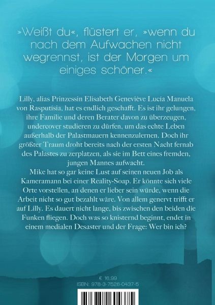 Lilly, alias Prinzessin Elisabeth Geneviève Lucía Manuela von Rasputísia, hat es endlich geschafft. Es ist ihr gelungen, ihre Familie und deren Berater davon zu überzeugen, undercover studieren zu dürfen. Doch ihr größter Traum droht bereits nach der ersten Nacht fernab des Palastes zu zerplatzen, als sie im Bett eines fremden, jungen Mannes aufwacht. Mike hat so gar keine Lust auf seinen neuen Job als Kameramann bei einer Reality-Soap. Er könnte sich viele Orte vorstellen, an denen er lieber sein würde, wenn die Arbeit nicht so gut bezahlt wäre. Von allem genervt trifft er auf Lilly. Es dauert nicht lange, bis zwischen den beiden die Funken fliegen. Doch was so knisternd beginnt, endet in einem medialen Desaster und der Frage: Wer bin ich?