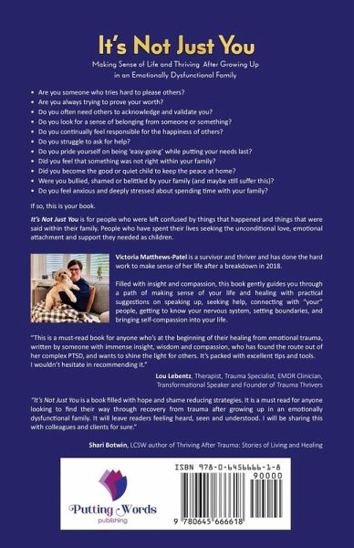 It's Not Just YouMaking sense of life and thriving after growing up in an emotionally dysfunctional family Are you someone who tries hard to please others? Are you always trying to prove your worth? Do you often need others to acknowledge and validate you? Do you look for a sense of belonging from someone or something? Do you continually feel responsible for the happiness of others? Do you struggle to ask for help? Do you pride yourself on being 'easy-going' while putting your needs last? Did you feel that something was not right within your family? Did you become the good or quiet child to keep the peace at home? Were you bullied, shamed or belittled by your family (and maybe still suffer this)? Do you feel anxious and deeply stressed about spending time with your family? If so, this is your book. It's Not Just You is for people who were left confused by things that happened and things that were said within their family. People who have spent their lives seeking the unconditional love, emotional attachment and support they needed as children. Victoria Matthews-Patel is a survivor and thriver and has done the hard work to make sense of her life after a breakdown in 2018. Filled with insight and compassion, this book gently guides you through a path of making sense of your life and healing with practical suggestions on speaking up, seeking help, connecting with "your" people, getting to know your nervous system, setting boundaries, and bringing self-compassion into your life. "This is a must-read book for anyone who's at the beginning of their healing from emotional trauma, written by someone with immense insight, wisdom and compassion, who has found the route out of her complex PTSD, and wants to shine the light for others. It's packed with excellent tips and tools. I wouldn't hesitate in recommending it."Lou Lebentz, Therapist, Trauma Specialist, EMDR Clinician, Transformational Speaker and Founder of Trauma Thrivers "It's Not Just You is a book filled with hope and shame reducing strategies. It is a must read for anyone looking to find their way through recovery from trauma after growing up in an emotionally dysfunctional family. It will leave readers feeling heard, seen and understood. I will be sharing this with colleagues and clients for sure." Shari Botwin, LCSW author of Thriving After Trauma: Stories of Living and Healing
