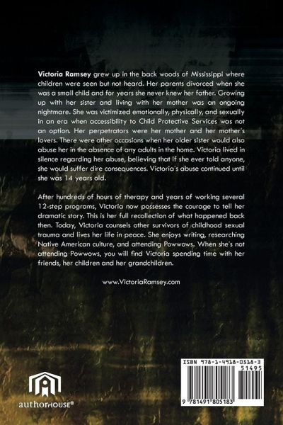 The Deep South, where Victoria Ramsey grew up, is often referred to as the Bible Belt. However, it was only on rare occasions that Victoria's aunt would come over and take her to church. The church was located very far away, deep in the back woods. There were no houses or businesses close to the church. A dense thicket of tall pine trees lined the road that led to the church. The drive to the church was frightening, Victoria's aunt would speed down the dark, winding dirt road through the woods. From the backseat, Victoria could only see the beams of the car's headlights flashing across the clay red road and the nearby tree line. There was silence inside the car. No one said a thing. It was as if everyone was holding their breath. The only sound came from outside the car, tires screeching as they turned sharply to avoid running into the deep ditch alongside the road. Occasionally, her aunt would break the silence by stating, "The devil is trying to stop us!" Then Victoria would remember her mother's last words before getting into her aunt's car. "You better listen to that preacher! The devil's gonna getcha!" Victoria grew up believing that at any moment, the devil would leap out and capture her. This created much fear and by the age of six, Victoria believed she was a sinful little girl that no one loved or would ever love. So for her being wanted by the devil made perfect sense. The truth wouldn't be revealed until much later as to the identity of the real devil.