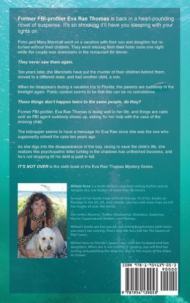 Former FBI-profiler Eva Rae Thomas is back in a heart-pounding novel of suspense. It's so shocking it'll have you sleeping with your lights on. Peter and Mary Marshall went on a vacation with their son and daughter but returned without their children. They went missing from their hotel room one night while the couple was downstairs in the restaurant for dinner. They never saw them again. Ten years later, the Marshalls have put the murder of their children behind them, moved to a different state, and had another child, a son. When he disappears during a vacation trip to Florida, the parents are suddenly in the limelight again. Public opinion seems to be that this can be no coincidence. These things don't happen twice to the same people, do they? Former FBI-profiler, Eva Rae Thomas is doing well in her life, and things are calm until an FBI agent suddenly shows up, asking for her help with the case of the missing child. The kidnapper seems to have a message for Eva Rae since she was the one who supposedly solved the case ten years ago. As she digs into the disappearance of the boy, racing to save the child's life, she realizes this psychopathic killer lurking in the shadows has unfinished business, and he's not stopping till his debt is paid in full. IT'S NOT OVER is the sixth book in the Eva Rae Thomas Mystery Series.