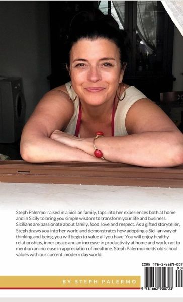 Steph Palermo, raised in a Sicilian family, taps into her experiences both at home and in Sicily to bring you simple wisdom to transform your life and business. Sicilians are passionate about family, food, love and respect. Steph tackles Sicilian traditions like the family dinner table, forgiveness, loyalty and generosity. She offers tips on incorporating these values and others into your life to strengthen familial bonds, inspire lives and ultimately positively affect the bottom line in your business. As a short story teller, Steph draws you into her world and demonstrates how adopting a Sicilian way of thinking and being, you will begin to value all you have. You will enjoy healthy relationships, inner peace and an increase in productivity at home and work, not to mention an increase in appreciation of mealtime. If you are of Italian or Sicilian descent, you will identify with Steph's stories as you stroll down memory lane. She will remind you of what you may have forgotten, or you will nod in agreement as a practicing Sicilian. This book is for anyone who wants to truly embrace life and enjoy every moment. Whether you are interested in positively influencing your family, a single person who desires to offer and receive value in relationships or a business owner who cares about employees and increasing productivity. You will learn what it takes to reach your desired outcomes. Steph Palermo melds old school values with our current, modern day world.