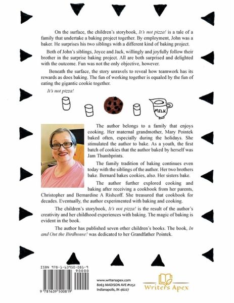 On the surface, the children's storybook, It's not pizza! is a tale of a family that undertake a baking project together. By employment, John was a baker. He surprises his two siblings with a different kind of baking project. Both of John's siblings, Joyce and Jack, willingly and joyfully follow their brother in the surprise baking project. All are both surprised and delighted with the outcome. Fun was not the only objective, however. Beneath the surface, the story unravels to reveal how teamwork has its rewards as does baking. The fun of working together is equaled by the fun of eating the gigantic cookie together. It's not pizza!