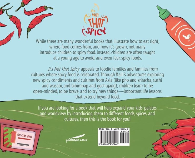 While there are many wonderful books that illustrate how to eat right, where food comes from and how it's grown, not many introduce children to spicy food. Instead, children are often taught at a young age to avoid, and even fear, spicy foods. It's Not That Spicy appeals to foodie families and families from cultures where spicy food is celebrated. Through Kaili's adventures exploring new spicy condiments and cuisines from Asia (like pho and sriracha, sushi and wasabi, and bibimbap and gochujang), children learn to be open-minded, to be brave, and to try new things-important life lessons that extend beyond food. If you are looking for a book that will help expand your kids' palates and worldview by introducing them to different foods, spices, and cultures, then this is the book for you!