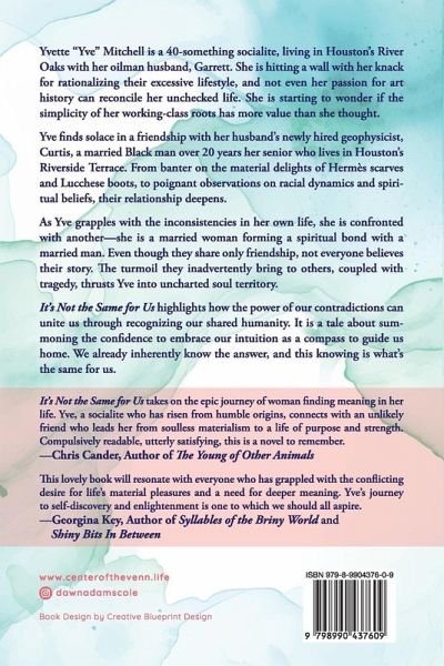 Yvette "Yve" Mitchell is a 40-something socialite, living in Houston's River Oaks with her oilman husband, Garrett. She is hitting a wall with her knack for rationalizing their excessive lifestyle, and not even her passion for art history can reconcile her unchecked life. She is starting to wonder if the simplicity of her working-class roots has more value than she thought. Yve finds solace in a friendship with her husband's newly hired geophysicist, Curtis, a married Black man over 20 years her senior who lives in Houston's Riverside Terrace. From banter on the material delights of Hermès scarves and Lucchese boots, to poignant observations on racial dynamics and spiritual beliefs, their relationship deepens. As Yve grapples with the inconsistencies in her own life, she is confronted with another - she is a married woman forming a spiritual bond with a married man. Even though they share only friendship, not everyone believes their story. The turmoil they inadvertently bring to others, coupled with tragedy, thrusts Yve into uncharted soul territory. It's Not the Same for Us highlights how the power of our contradictions can unite us through recognizing our shared humanity. It is a tale about summoning the confidence to embrace our intuition as a compass to guide us home. We already inherently know the answer, and this knowing is what's the same for us.