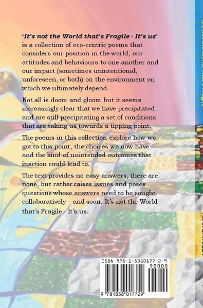 'It's not the World that's fragile - it's us' is a collection of eco-centric poems that consider our position in the world, our attitudes and behaviours to one another and our impact (sometimes unintentional, unforeseen, or both) on the environment on which we ultimately depend. Not all is doom and gloom but it seems increasingly clear that we have precipitated and are still precipitating a set of conditions that are taking us towards a tipping point. The poems in this collection explore how we got to this point, the choices we now have and the kind of unintended outcomes that inaction could lead to. The text provides no easy answers, there are none, but rather raises issues and poses questions whose answers need to be sought collaboratively - and soon. It's not the World that's fragile - it's us.